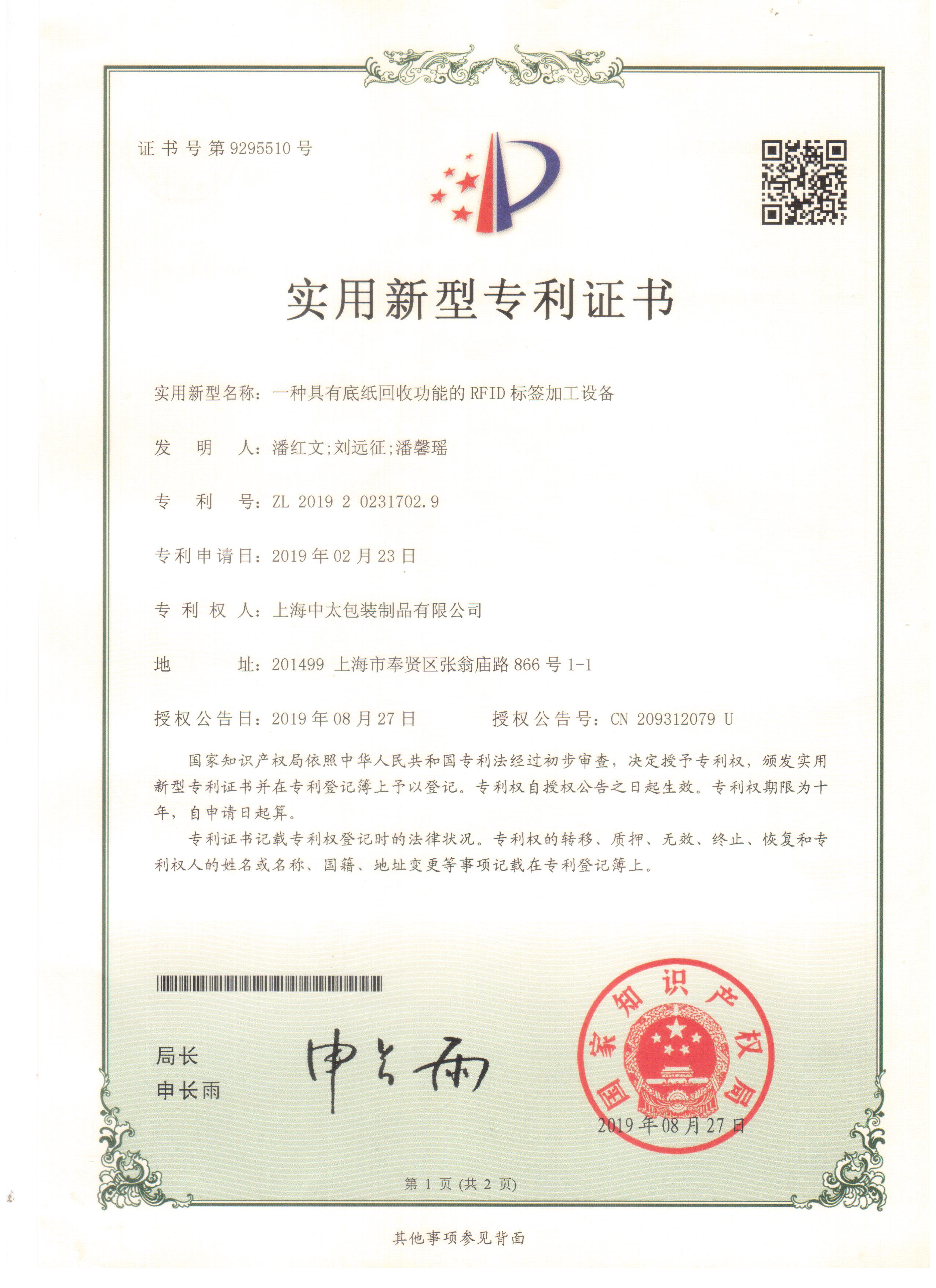 中太实用新型专利 一种具有底纸回收功能的RFID标签加工设备